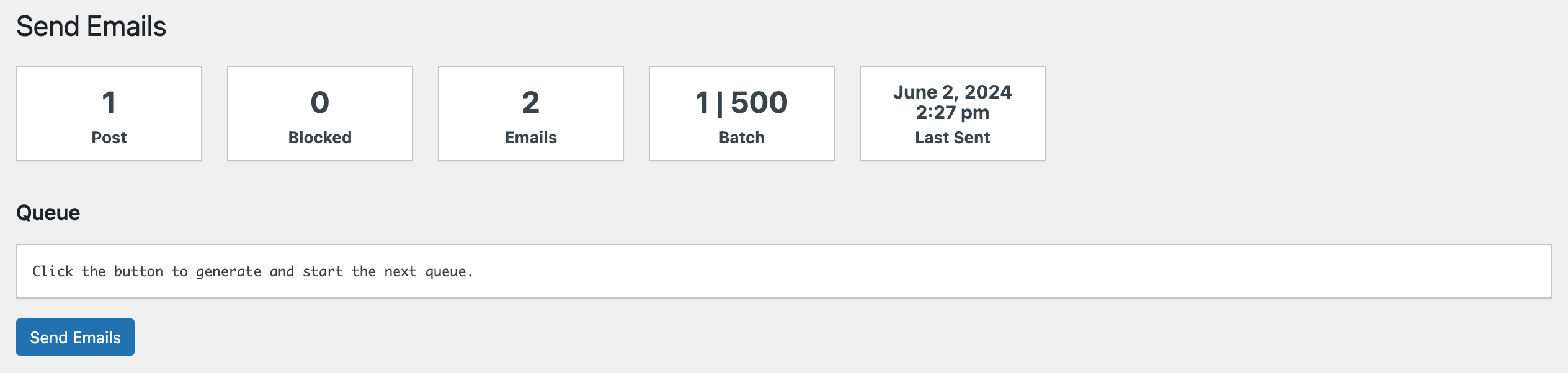 This is where you can send notifications to subscribers. The plugin does not send notifications automatically, as it prioritizes control over convenience. Sending notifications requires just the push of a button, which is considered manageable.