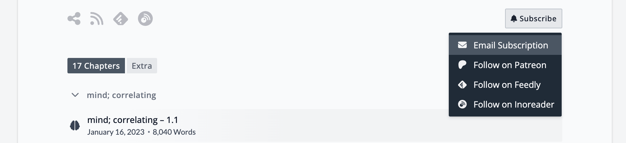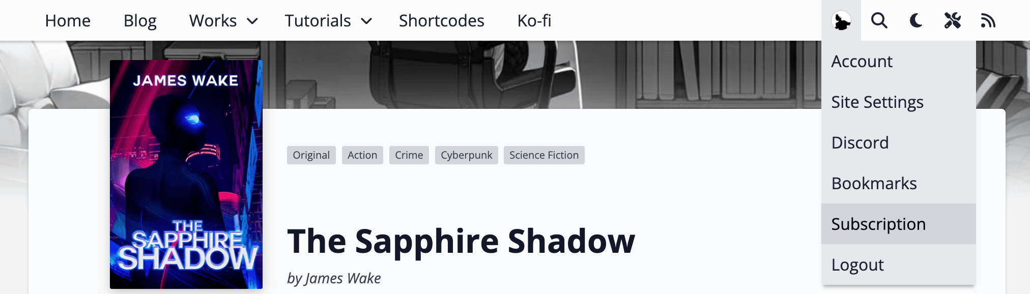 The plugin integrates seamlessly into the Fictioneer theme. You’ll find a new option in the [Subscribe] popup menu, the user menu, and the mobile menu to open the subscription modal. The user profile is extended with a new section to link your subscription, which can use a different email address, and enable Follows to automatically subscribe to a story.
