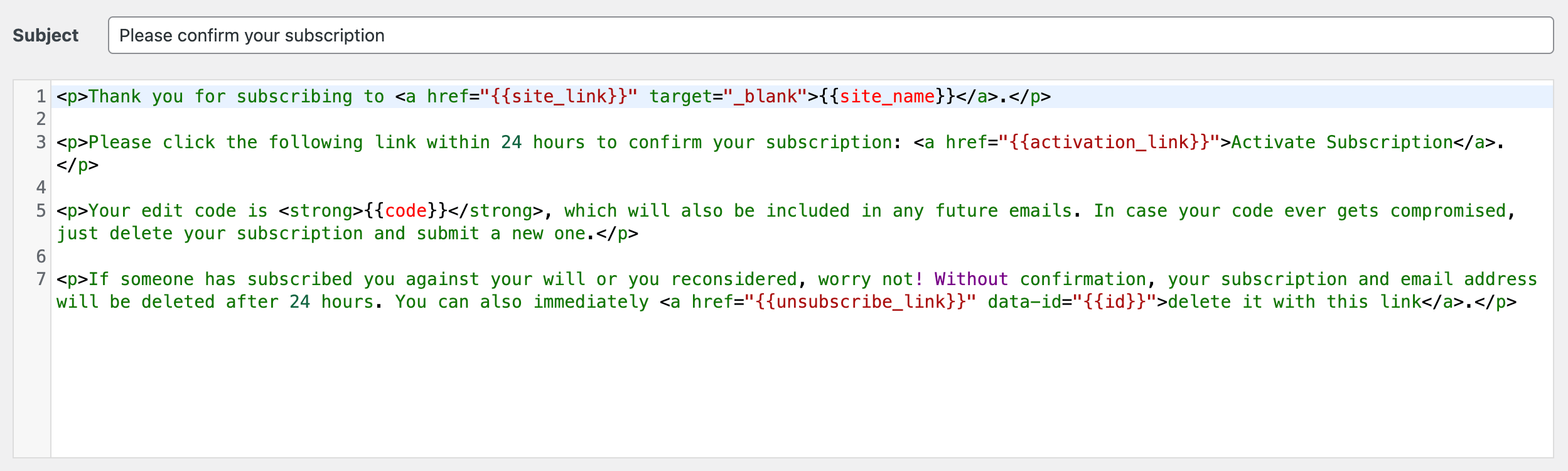 Templates allow you to customize the emails, split into layouts and partials. Each email is based on a single layout, while partials are snippets that can be included in certain layouts via tokens. Tokens are replacement keys within double curly brackets that are substituted with dynamic content related to the subscriber and their selected scopes. You can also decide on the subject of each email.